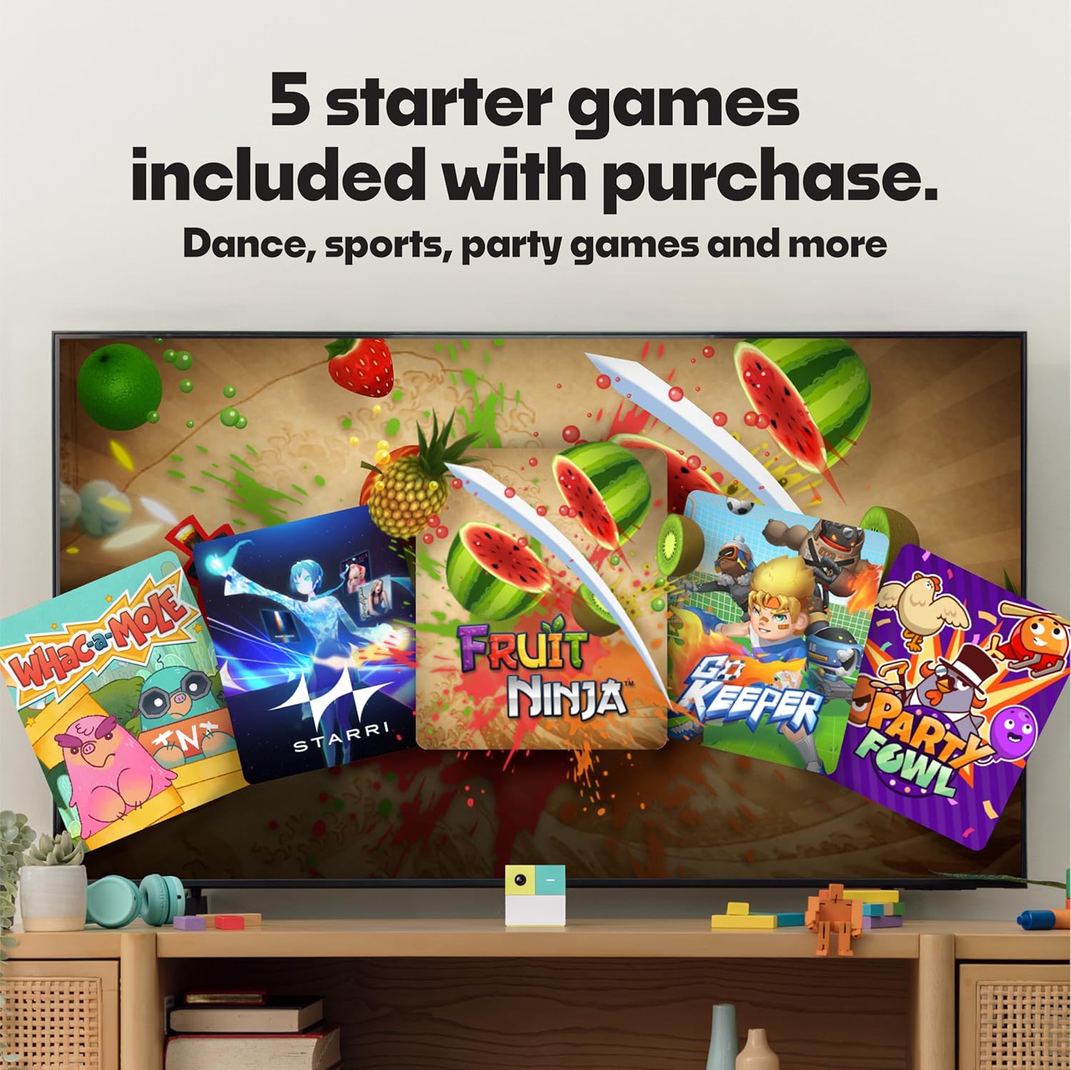 The Nex Playground comes with five starter games, including the popular Fruit Ninja, Starri, Whac-a-Mole, Go Keeper, and Party Fowl. These games are designed to get your family moving, and with the built-in camera tracking motion and natural body movements, anyone can jump in and play. The setup process is straightforward, with a simple HDMI connection to your TV or projector, making it easy to get started.