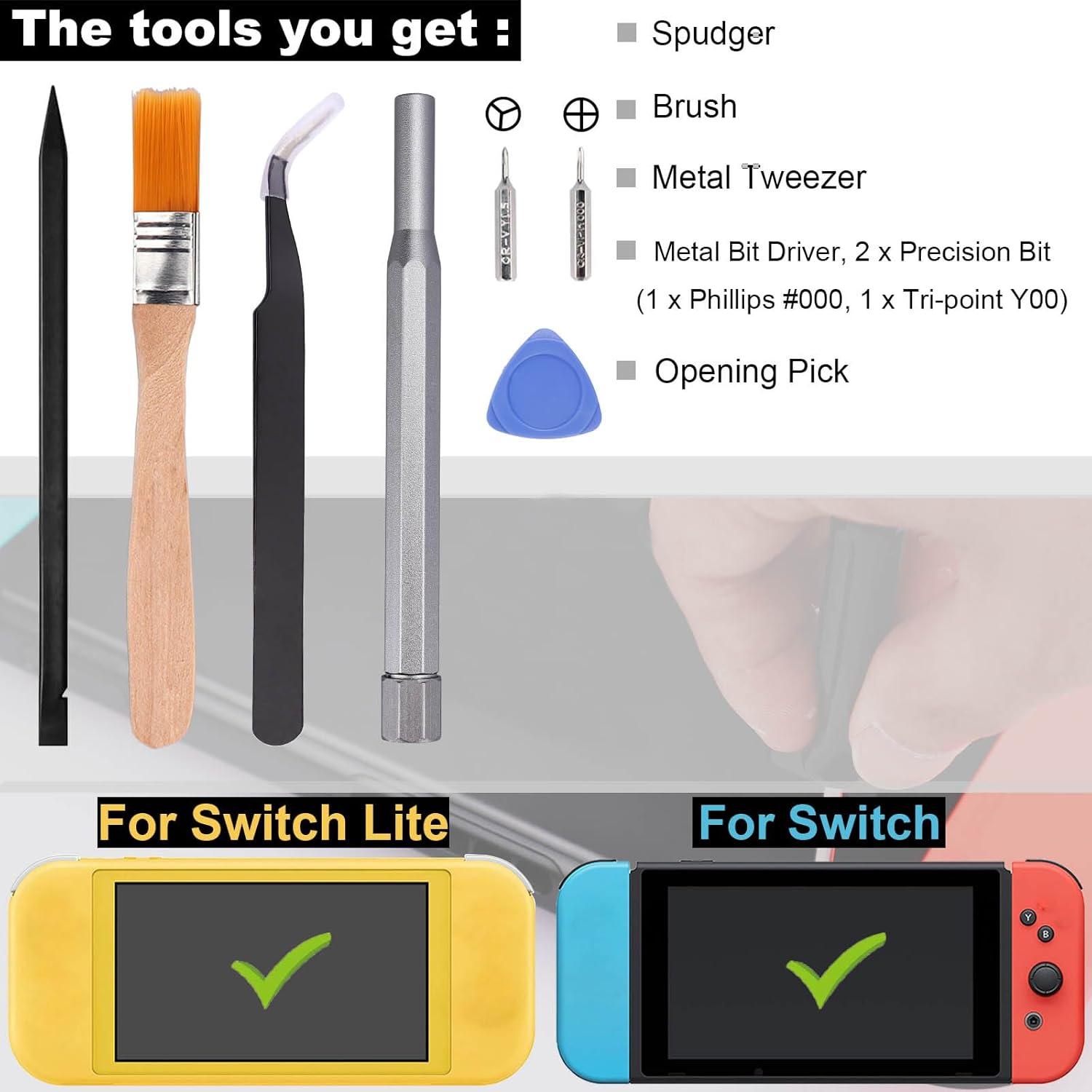 The package includes a set of tools and accessories to aid in the disassembly and replacement process. The 8 reinforced back cover screws are designed to replace old, damaged, or missing screws on the Nintendo Switch Lite console. The metal screwdriver, tweezer, brush, spudger, and opening pick are all high-quality tools that can help make the disassembly process easier and more efficient.