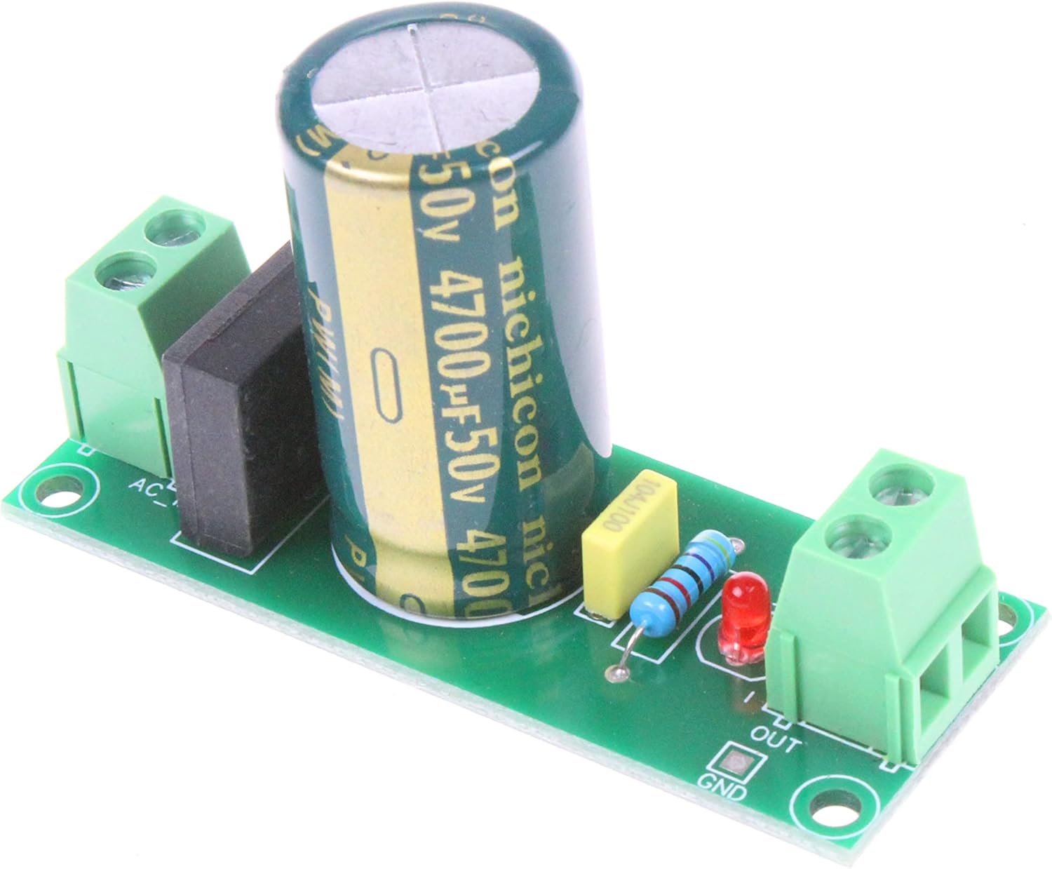 The NOYITO 50V 4700uF 6A Rectifier Filter Power Board is a compact, versatile power module that converts AC voltage to DC voltage, making it an essential component in many electronic circuits. With its green PCB and compact dimensions of 63.4×24.1×37.3mm (LWH), this module is not only functional but also space-efficient, allowing it to be easily integrated into a wide range of projects and devices.