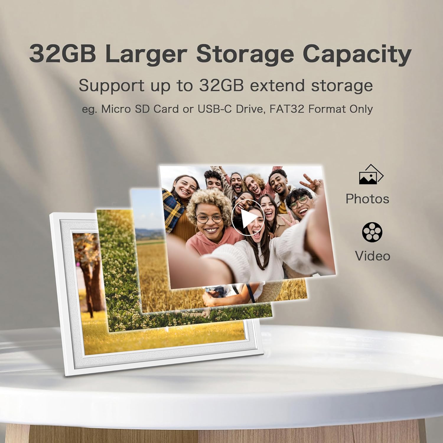 The frame comes with 32GB of built-in memory, which can store over 50,000 photos. Additionally, it supports up to 32GB of external storage, allowing you to expand your storage capacity as needed. You can transfer photos via external storage or through a computer, eliminating the need for WiFi.
