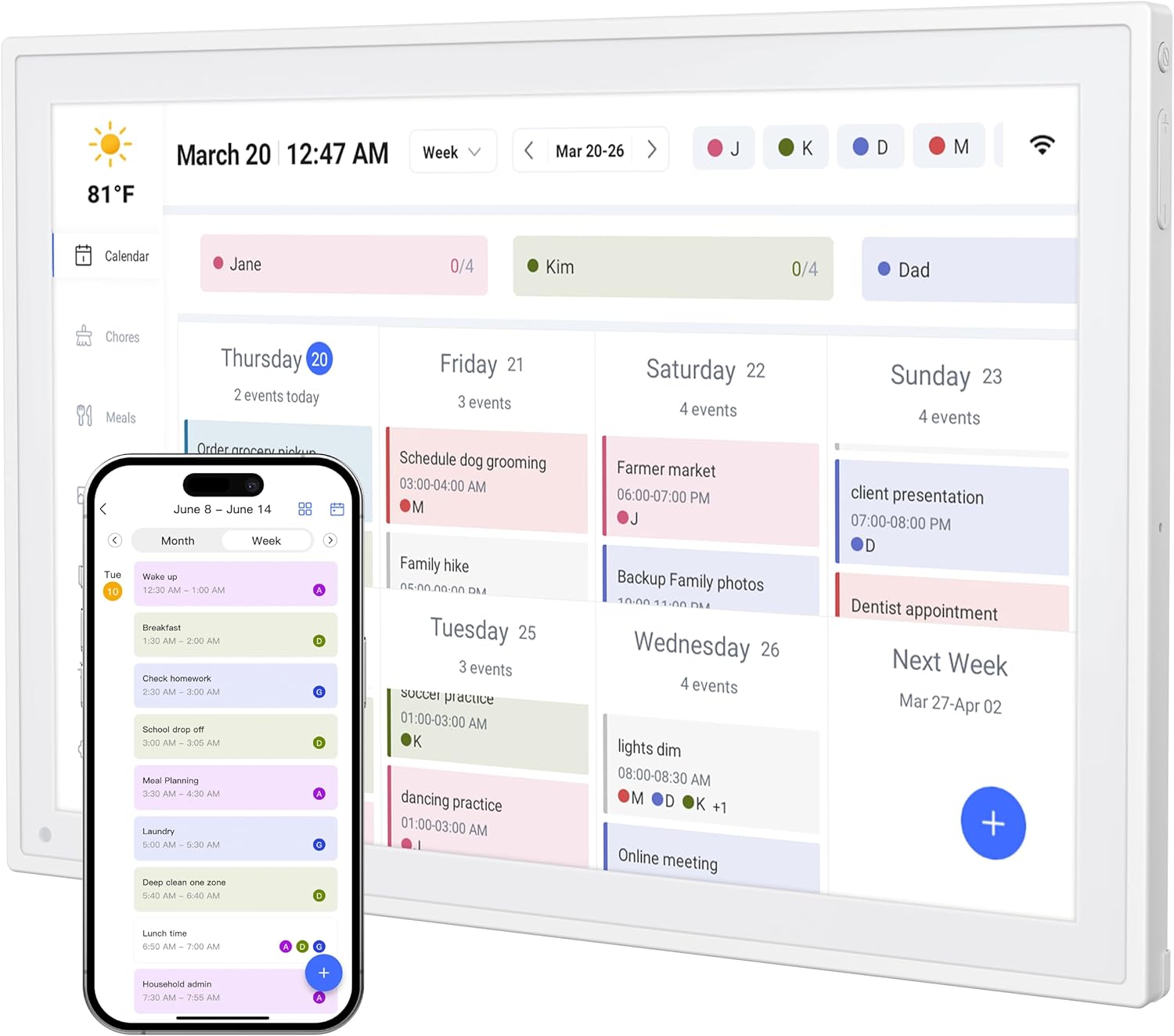- Family shared calendar supporting up to 20 members with color-coded personal schedules
