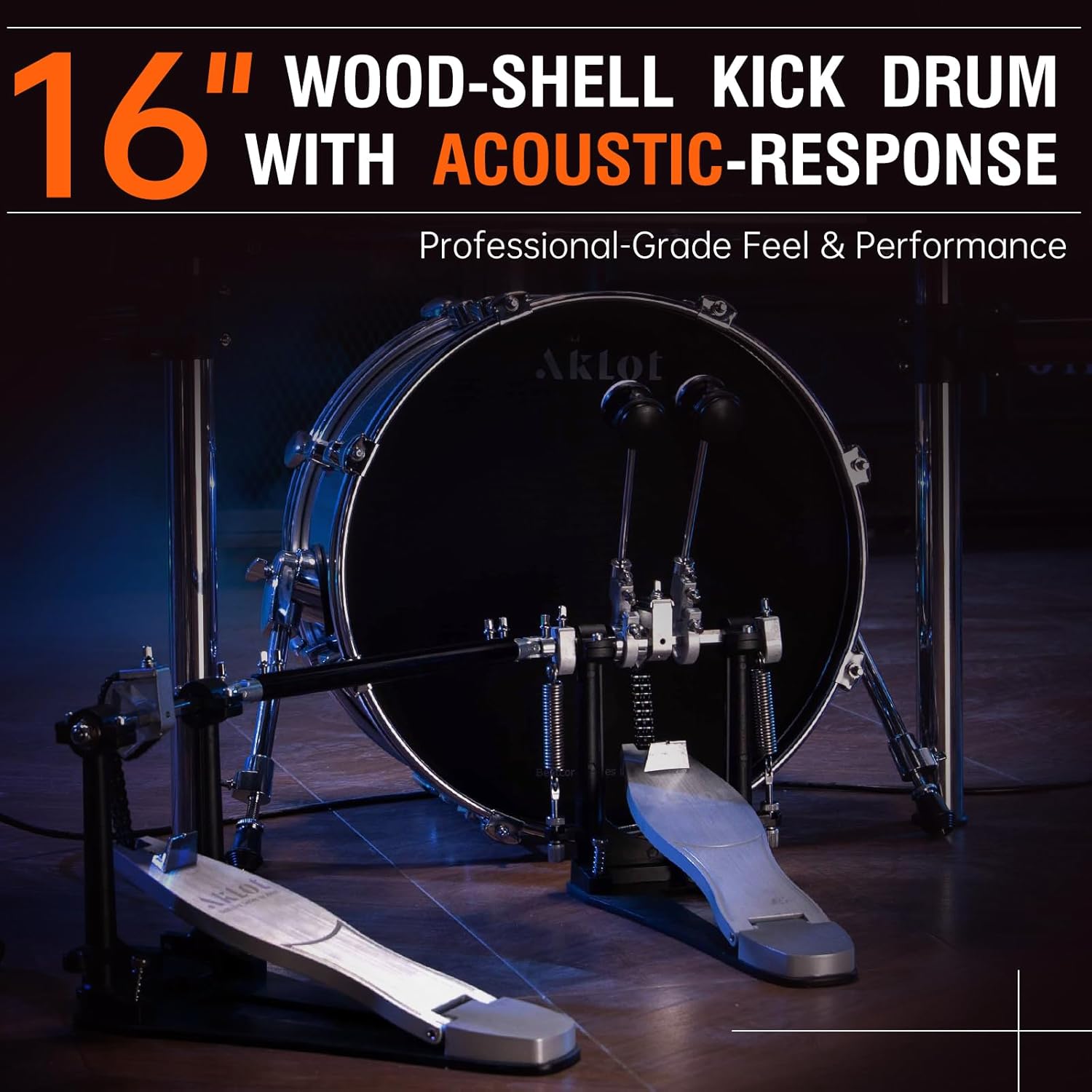 The AKLOT drum set features a 16” wooden double pedal bass drum, which is designed to deliver an authentic acoustic-like response. The responsive bass drum pad provides excellent rebound and dynamic tracking, making it ideal for developing fast doubles, heel-toe techniques, and complex metal patterns. The adjustable sensitivity and tension-tunable mesh head ensure quick rebounds and precise trigger accuracy, allowing drummers to build endurance and precision. Whether you’re playing thunderous grooves or technical rhythms, this setup transforms your footwork into studio-quality sound.