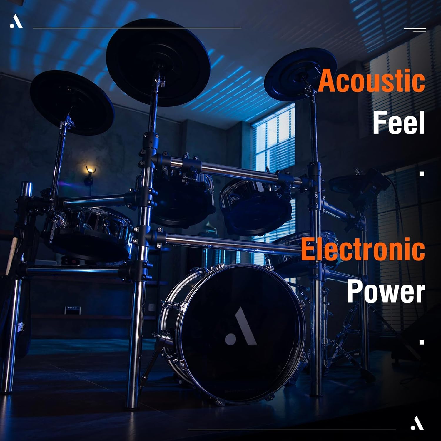 The AKLOT drum set features triple-ply mesh tom drums that deliver acoustic-like rebound and response, with dual-zone triggering for accurate head and rim detection. The tension-adjustable design allows customized feel from tight to loose settings, while removable muting rings enable instant switching between full resonance (for live play) and 80% noise-reduced mode (for silent practice). This versatility makes the AKLOT drum set perfect for both live performances and quiet practice sessions.