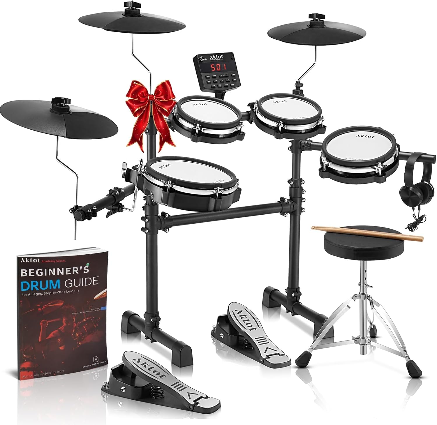 The AKLOT B-CORE530 Electric Drum Set comes with a structured lesson book written by a professional drummer, providing a comprehensive guide for beginners and intermediate players. The kit also includes a drum throne, drumsticks, and headphones, making it a complete package for drummers to get started. The tunable mesh snare and tom heads allow drummers to fine-tune the rebound to their preference, providing a satisfying, acoustic-like feel while staying quiet.