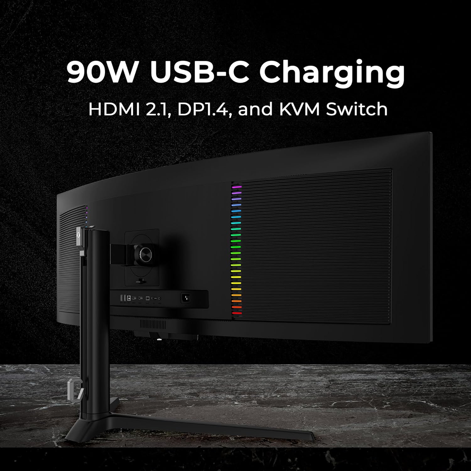 The Deco Gear 49-inch Super UltraWide QD-OLED monitor offers a wide range of connectivity options, including HDMI 2.1, DisplayPort 1.4, USB-C with 90W Power Delivery, and USB-A 3.0 ports. The monitor also features a KVM switch, allowing users to manage multiple computers with a single keyboard and mouse, streamlining their workspace for productivity. The height-adjustable stand with tilt, swivel, and pivot adjustments ensures optimal comfort and ergonomics.