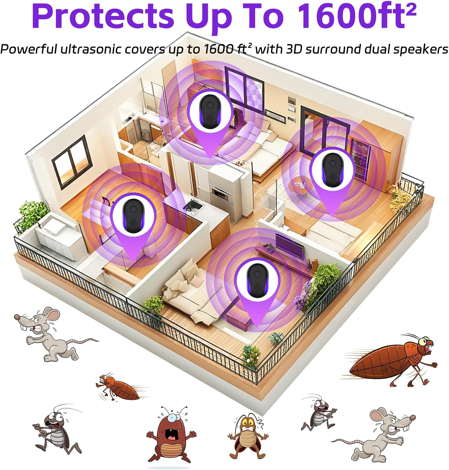 Each unit is effective for up to 1,600 square feet, which covers most average-sized rooms or open-plan areas. To maximize effectiveness, you’ll want to use one in each major room—or in problem areas such as kitchens, garages, basements, and attics—to create overlapping coverage. Because ultrasound cannot travel through walls, you’ll need to think strategically about placement to avoid blocked coverage.
